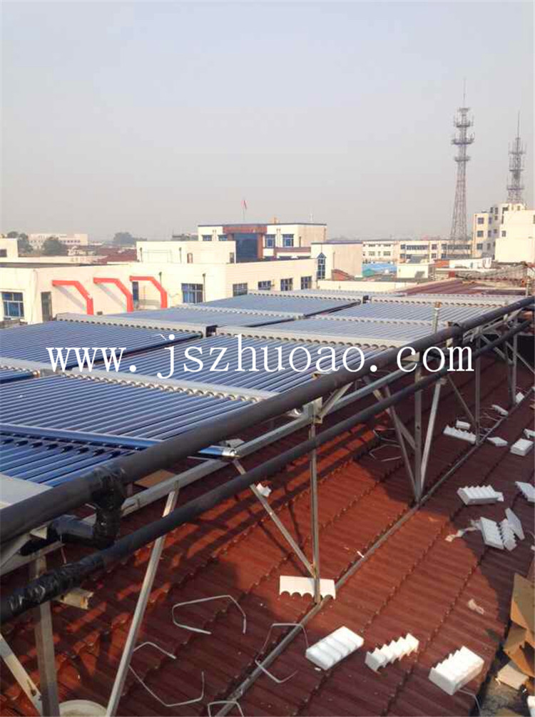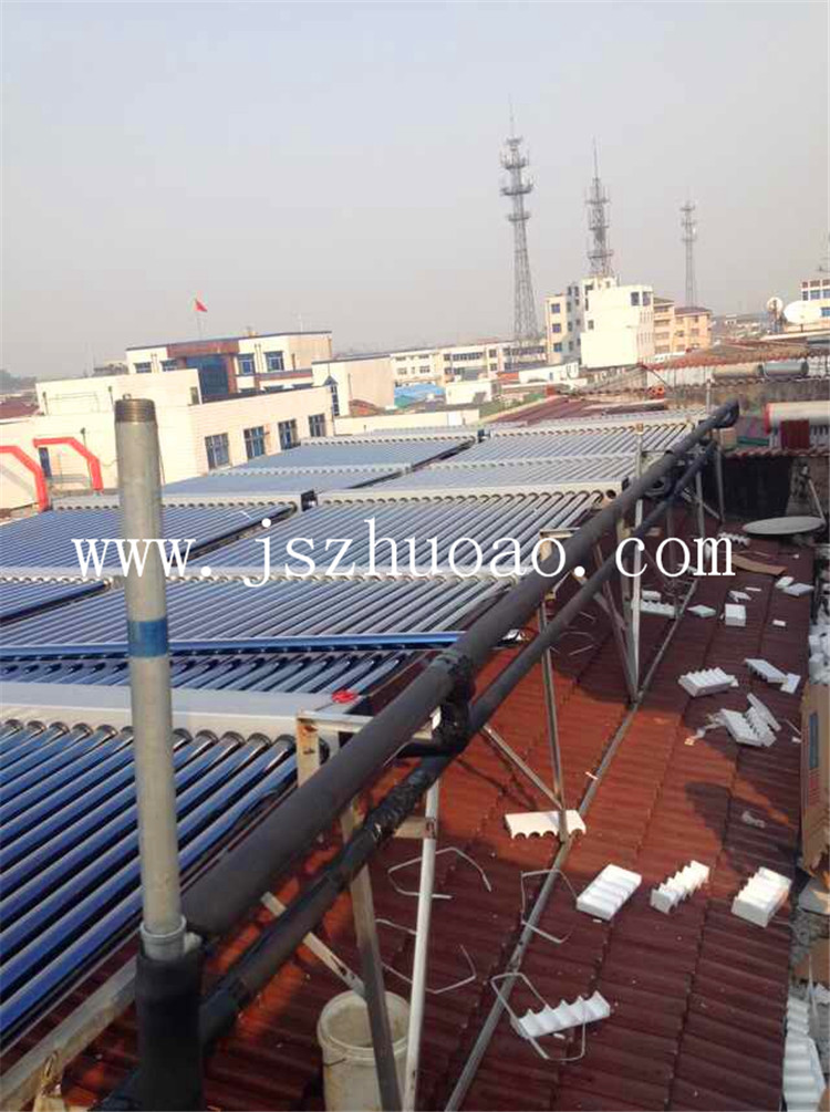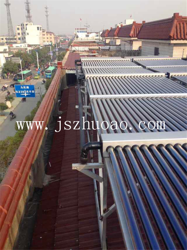 工程介紹:6組太陽能集熱模塊,1臺3噸不銹鋼保溫水箱,配置12KW電加熱進行輔助加熱。